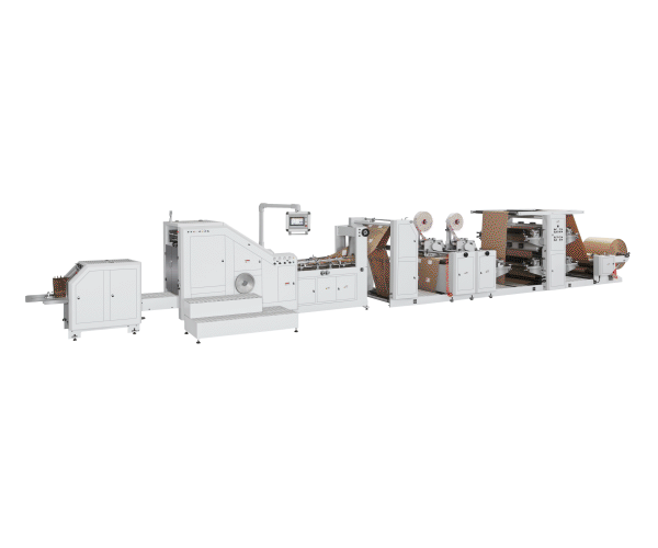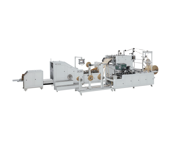 The Fully Automatic Handle Paper Bag Machine(120-220pcs/min) uses sheet paper, reel reinforced paper and paper twist rope as the raw material, and carries out paper handle manufacturing. handle patching, top folding, tube forming, gusset forming, bottom forming, compaction output or stick reinforced paper, top folding, tube forming, gusset forming, punch eyelets, bottom pasting, and compaction output in one continuous process.